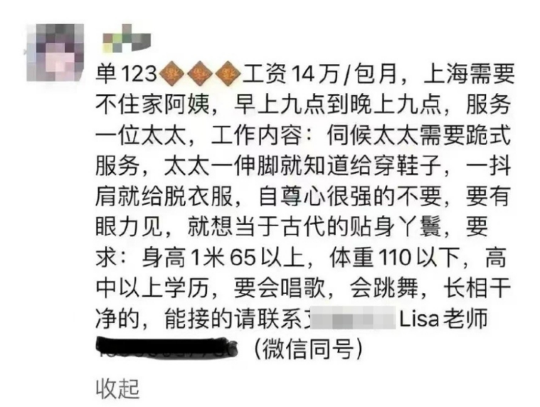 前阵子,上海太太月薪14万招保姆的信息,在网上炸开了锅。