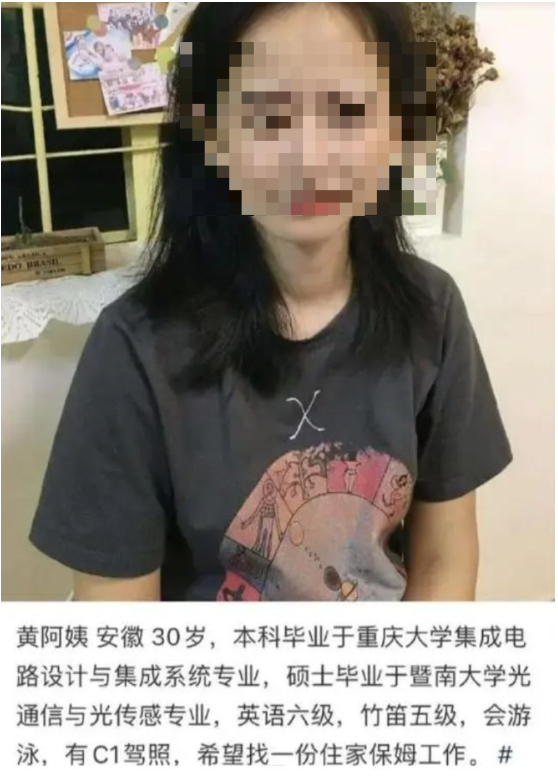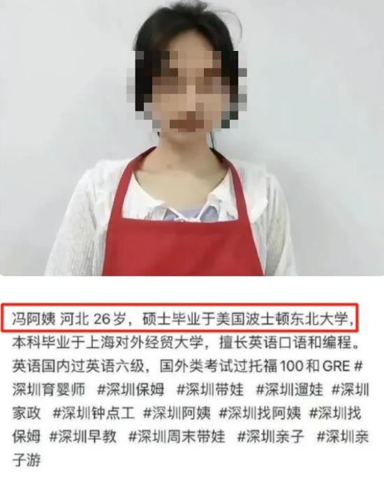 比如前阵子,网上流传的"高端美女保姆"的求职简历,清一色的海归、硕士,年轻貌美。