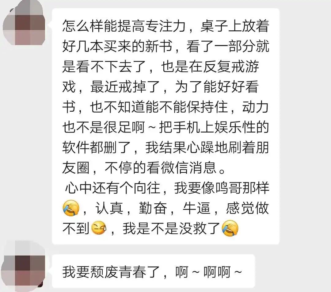 于是,为了重回高刺激的「怀抱」,你习惯性的拿起了手机,在各种APP之间欢呼雀跃。然而问题是,你越沉迷游戏、视频、小说,内心便越空虚,于是形成了恶性循环。当你习惯了各类信息的高频刺激,你会变得越来越急躁,越来越没耐心去做一件事了。原因很简单啊,你的注意力都被这些高频刺激的信息给捕获了。在这样的环境里,你每触碰一次屏幕,每点击一个按键,都会立即给你反馈结果,你已经对即时反馈形成了「路径依赖」。久而久之,你的心态也被「训练」成急功近利,追求短期速成。所以,当你的注意力从某个高频刺激的对象移开时,只会转移到另一个高频刺激的对象上面。比如说,你玩了几小时游戏,直到强制休息,这个时候,你是很难静下心来学习的。因为学习对你来说是程度很低的刺激,你根本没那个耐心。即使你强迫自己学习,也很难专注,还是会转移到高频刺激的事物上面。不信你看看下面这位读者,反复的「安装—卸载」游戏,也很难静下心来看书。即使他把所有娱乐软件卸载了,注意力也只会从游戏转移到朋友圈。回想一下,你已经多久没有心平气和的坐下来,看一本书,或者思考一件事了。