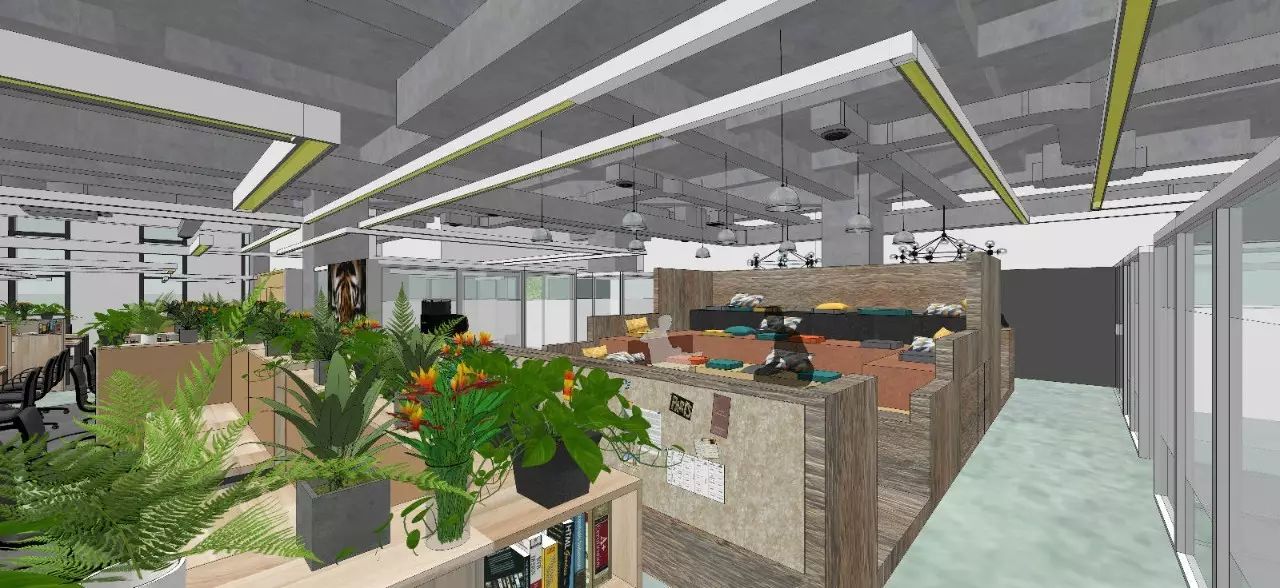 办公区域的大量绿色植物抬眼可见,绿色清新的办公环境使得工作与自然有机结合在一起。