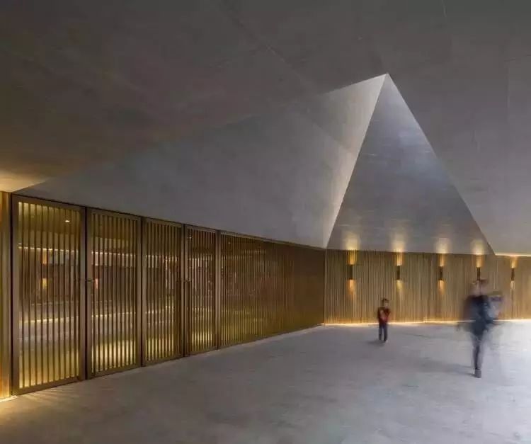 The roof of the main hall, which appears heavy, actually is made of an aluminium honeycomb structure which lightens the load. Three skylights of different shapes bring natural light in the hall, thereby bringing the space closer to nature.