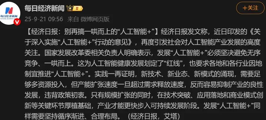 经济日报近期发文,发展人工智能+必须坚决避免无序竞争、一哄而上,要求各地各行业因地制宜推进人工智能+,保持良性发展,不要违背政策初衷。而,今年再往前的3月份两会期间,谭铁牛院士也提到过,我们要拥抱AI,但是要警惕一哄而上和一哄而散。人工智能当然要发展,但是并不需要每个省市都要重复建设,更不需要内卷式的发展。国家对于人工智能的相关发文,绝非简单的“泼冷水”,而是在当前的产业发展阶段下,一次极具前瞻性的预期管理。这并不是为了浇灭人工智能发展的蓬勃火焰,而是为了去掉虚火,使得行业能够少走弯路,持续健康地发展。事实上,我们从房地产、生猪养殖、新能源汽车等行业的发展教训中,已经多次感受到了一哄而上、一哄而散的危害性;所以,我们不得不防人工智能再次重蹈覆辙。大家已经能够深刻地感受到各项数据的冰冷,无论是从二手房的销售价格、租赁价格,还是土地拍卖价格、在建住宅的面积等等数据都能感受到一哄而散的无力感。但是,大家千万不要忘记了这个行业也曾经繁荣过,曾经一哄而上过。恒大集团就是整个行业的一个缩影。恒大在2015年到2020年期间的盲目扩张,项目覆盖深圳、广州、武汉、郑州等多个城市。而恒大之所以能够快速拿地,就是通过高杠杆融资不断滚雪球,巅峰时期债务规模高达2.4万亿元。一个企业的债务,相当于一个深圳2020年的GDP总量了。所以,恒大这种“重规模轻现金流”的无序扩张模式,终究难逃历史规律,在2021年爆发债务危机。恒大虽然已经退市了,但是它在市场上的严重影响仍然没有完全消退。其中广州、深圳、武汉、郑州等重点城市受影响较为严重,许多楼盘已经长满杂草,遥遥无期。此外,恒大的问题也涉及到了许多上下游企业款项支付的问题,许多公司的应收账款变为坏账。特别是金螳螂仅2021年计提坏账就导致亏损40亿-50亿元,简直是黑天鹅。而其他的三棵树、索菲亚、皮阿诺等不计其数的企业都受到牵连。其中有一些没有上市的,抗风险能力小的受牵连企业已经降薪裁员、破产倒闭。恒大的债务问题还造成了一定范围内的金融震荡,影响到了职工的信托、三方理财,部分银行的借贷等。这个就不能多讲了。请记住,这仅仅是恒大一家企业而已。而,整个行业一哄而上、一哄而散对社会的影响将不可估量。我们讲过人工智能的发展为什么要因地制宜,要良性发展。因为,我们经历太多这种一哄而上的惨痛教训了,除了房地产之外,我们再来讲讲生猪养殖行业。2020年到2022年的猪周期中,大量的企业跟风扩产导致行业短短2、3年就严重地供大于需。2020年生猪价格飙至36.6元/公斤的历史高位,行业利润简直堪比金矿。各个企业都开始掀起扩产潮,生怕错过了一夜暴富的机会。其中,总部位于江西南昌的正邦科技就是一个激进扩张的典型案例。2020年到2021年正邦科技累计新增能繁母猪存栏超50万头,2021年生猪出栏量同比增长56%至1492万头。一方面是股权融资,在股票市场上高位发行股票募资进行扩建。另一方面就是去银行借钱,进行债务融资。正邦科技2021年三季度财报数据显示,资产负债率已经超过90%。你借钱扩张,我也跟着借钱扩张,到最后就是整个行业的一哄而上,供应了大量的猪肉,但是咱们就是14亿张嘴啊,多了也吃不了。任何事情都无法违背简单的供需规律。生猪价格在整个产业都大规模扩建的情况下开始暴跌,2022年10月跌至11.8元/公斤,较2020年高点近乎“腰斩再腰斩”,行业大多数企业都进入深度亏损期。正邦科技2021年净亏损达188.19亿元,2022年续亏95.44亿元。这时候正邦的资金链彻底断裂,已经资不抵债,欠了江西地区不少银行一屁股债务。经济日报提到,人工智能的发展要因地制宜、良性发展。其实,任何一个行业都应该因地制宜、良性发展。大家想一下,正邦科技本身就身处江西,你的养殖业再怎么发展,也不可能搞过农业大省河南的牧原股份啊。正邦不仅让自己付出了沉重代价,也对江西当地的就业、税收、银行造成了冲击,更让投资正邦的无数股民饱受摧残。值得注意的是,正邦科技依然只是整个生猪养殖行业的一个缩影而已,整个行业里其实不少企业都遭遇了和正邦一样的命运。这无疑是对社会资源的一种巨大浪费。浪费了银行借贷、浪费了当地的就业、税收优惠等等。据中国汽车工业协会预测,2025年国内新能源汽车产能规划已超过5000万辆,而实际年销量预计不足3000万辆,产能利用率不足60%。而供大于需的结果就是,头部企业为了在存量市场里抢占市场份额,率先开启价格战,部分车型降价幅度高达30%,直接导致行业平均利润率从2023年的8.5%降至2024年的4.1%,接近盈亏平衡点。浙江嘉兴有一家汽车企业的生产基地,正是凭借“互联网造车”概念走红的哪吒汽车。它因市场竞争加剧,2023年净亏损达64.9亿元,至今都没有喘过气来,依然行走在悬崖旁边。2025年4月哪吒汽车原CEO张勇“跑路英国”之际。哪吒汽车留下的是拖欠供应商的超60亿元的欠款,留下的是3000多名员工被拖欠薪资、社保断缴、期权作废,留下的是40万车主面临车机断网、换电站瘫痪、充电桩押金难退,售后近乎崩溃。无论是浙江嘉兴的哪吒汽车,还是浙江温州的威马汽车、江苏盐城的高合汽车、还是百度和吉利联合打造的极越汽车等等,都出现了员工讨薪、供应链企业讨债,这背后又打翻了多少个家庭的几两碎