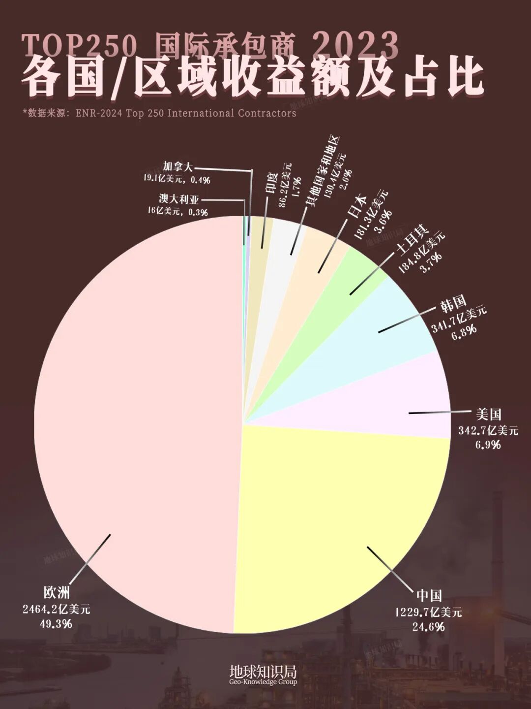 根据ENR的数据,2023年全球250强国际承包商海外工程收入的总值为4996亿美元,其中欧洲公司占据主导地位,贡献了2464亿美元(占49.3%)。可见,依靠旧殖民体系的遗泽,欧洲还是主要吃肉的玩家。