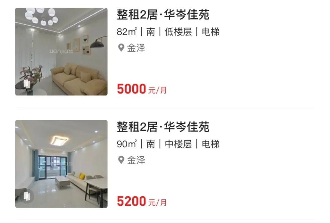 以华为青浦研发中心为例,2024年10月首批员工入驻后,周边与华为最近的华岑佳苑小区,两房的租金从去年上半年的2500元/月涨到5000元/㎡/图源:链家app