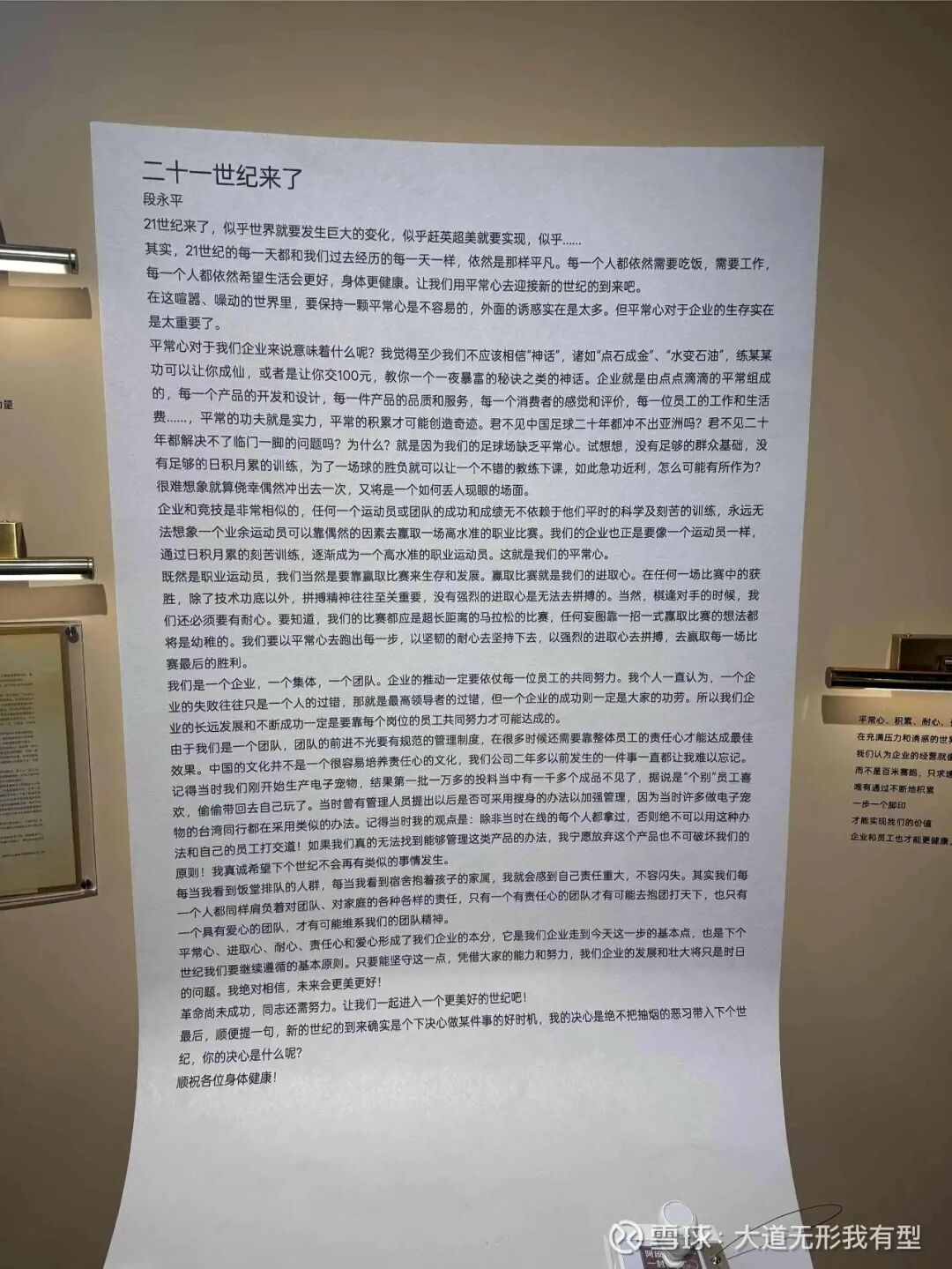 9月18日,段永平在雪球罕见晒出一张贴在墙上的旧文照片,题目为《二十一世纪来了》,并配文:“更健康更长久!争取下个三十年我还能来!”