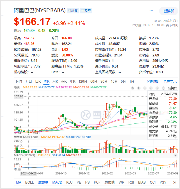 截至9月17日,阿里美股股价报收166.17美元/股,市值3961.49亿美元。若段永平这季度没有继续减持,仍持仓375万股,他对阿里的持仓市值已达到6.23亿美元,赚了大概1.98亿美元(约14亿人民币)。