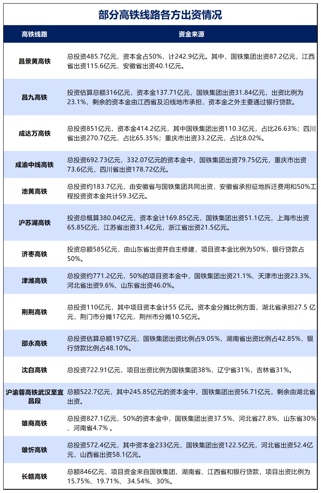 项目起于江西省赣州市,途经广东省河源市,终至广东省广州市,拟争取按客运专线、双线、电气化、350公里/小时的技术标准建设。目前国省铁路有关规划中全南无规划铁路。根据国家对铁路规划建设的相关要求,赣州至广州可通过赣深高铁、广汕高铁便捷到达,在一定时期内可较好满足旅客出行需求,赣广高铁近期不具备纳入国家铁路相关规划条件。线路全长约266公里,设计时速250~350km/h,计划总投资462亿元,途经成都、金堂、中江、三台、盐亭、阆中、巴中,远期规划延伸至陕西安康。成巴安高铁尚未纳入国家相关规划,暂不具备实施条件。根据《关于进一步做好铁路规划建设工作意见的通知》,西成高铁和成达万-西渝高铁两条四川北上出川高铁通道达到一定能力利用率后,再行考虑新通道的规划建设。从面上可以看到,这五条线路大多都是因为本就有平行线路,不能重复建设而无法实现。2021年国家发改委、交通部、国家铁路局、中国国家铁路集团四部门联合发布了《关于进一步做好铁路规划建设工作的意见》,其中明确:严格控制建设既有高铁的平行线路,既有高铁能力利用率不足80%的,原则上不得新建平行线路。新建铁路项目要严格按照国家批准的规划实施,规划内项目不得随意调整功能定位、建设时序和建设标准,未列入规划的项目原则上不得开工建设。第一,规划建设贯通省会及特大城市、近期双向客流密度2500万人次/年以上、中长途客流比重在70%以上的高铁主通道线路,可采用时速350公里标准。第二,规划建设串联规模较大的地级以上城市、近期双向客流密度2000万人次/年以上、路网功能较突出的高铁线路,可预留时速350公里条件。第三,规划建设近期双向客流密度1500万人次/年以上的高铁区域连接线,可采用时速250公里标准。第四,规划建设城际铁路线路,原则上采用时速200公里及以下标准。也就是说,串联省会或特大城市及以上的线路,时速按照350公里设计。串联较大地市,时速可以预留350公里。串联普通地市,时速按照250公里的动车设计。串联临近城市的城际铁路,则时速需要低于200公里。尤其是这一点,《关于进一步做好铁路规划建设工作的意见》文件第七条就明确点出,防范化解债务风险。比如2023年年末开通并让江西成为全国首个市市通350公里高铁的昌景黄高铁,总投资485.7亿元,资本金占50%,计242.9亿元。其中国铁出资87.2亿元,江西省出115.6亿元,安徽省出资40.1亿元。再比如正在模拟载客、月底即将通车、并改写东北没有市市通高铁省域的沈白高铁,总投资722.91亿元,其中国铁出资38%,辽宁出资31%,吉林出资31%。8月1日,财政部发布了《关于六起地方政府隐性债务问责典型案例的通报》,对沈阳辽中区、厦门、德州陵城区、武汉东湖新技术开发区、重庆武隆区、成都6个地方违规增加隐性债务进行通报、并问责。其中厦门新增隐性债务规模最高,成都次之,均超过了600亿元。中央通过集中曝光典型案例并严肃问责(涉及诫勉、党内警告、政务处分等),明确传递信号:任何形式的隐性债务新增都是绝对禁区,无论何种理由、何种层级、何种项目,都必须立即制止并倒查责任。最近几年,全国经济发展形势转变,除了全球政治格局变幻,与美国贸易对垒等因素外,内部的房地产问题、地方债问题突出,也是核心困扰。隐性债务,主要是城投债。