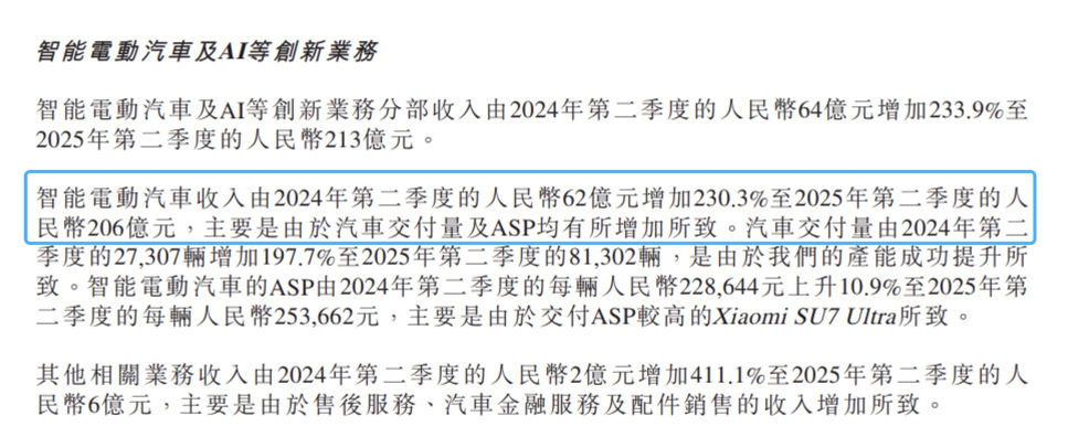 在2025年第二季度,小米智能电动汽车收入为206亿元/小米集团发布二季度业绩公告截图