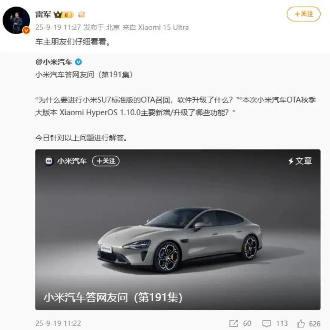 雷军转发小米汽车召回SU7相关回应