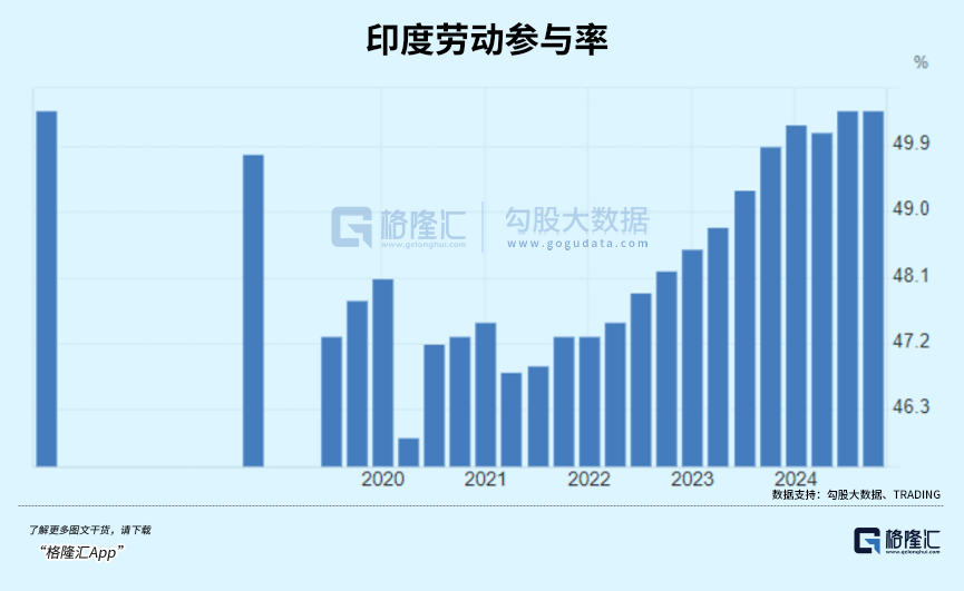 目前,印度的劳动参与率仍然只有50%左右,女性劳动参与率不足10%,与10年前几乎没有区别。