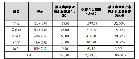 持股计划资金总额上限为2073万元,股票来源为公司回购专用账户的存量股份,规模不超过300万股,约占公司总股本的0.9%,受让价格为6.91元/股。