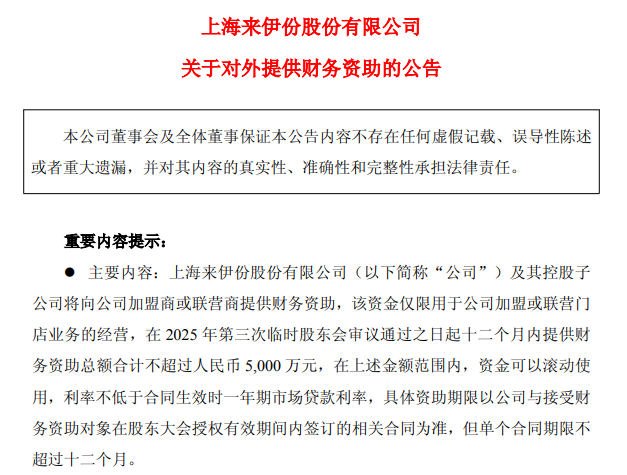 来伊份拟向重点城市或重点区域的加盟商或联营商,提供总额不超过5000万元的财务资助。