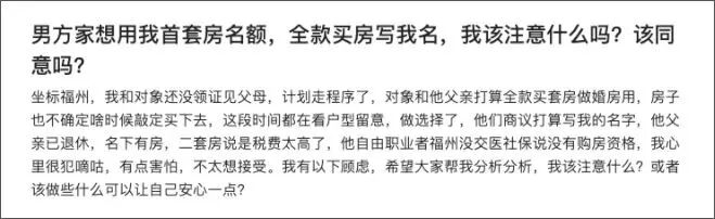 就像上海“洗房”事件,以及“男方家想用我首套房名额,全款买房写我名”事件。