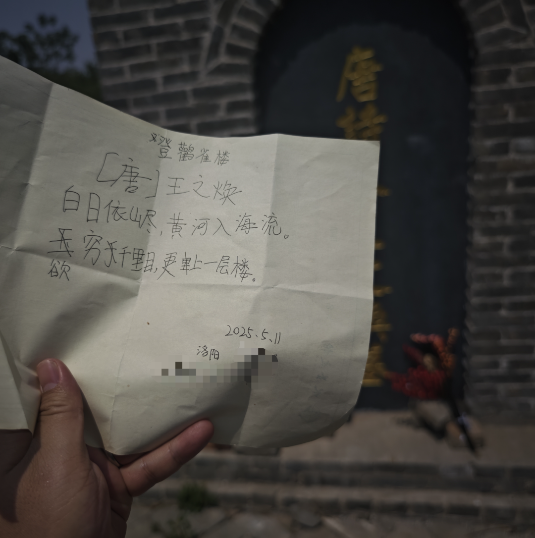 而在王之涣的墓前,最令我感动的,则是一张写着《登鹳雀楼》的白纸,纸上的笔迹稚嫩,一看落款人,果然是个小学生——中华文化的传承,在此刻具像化了。