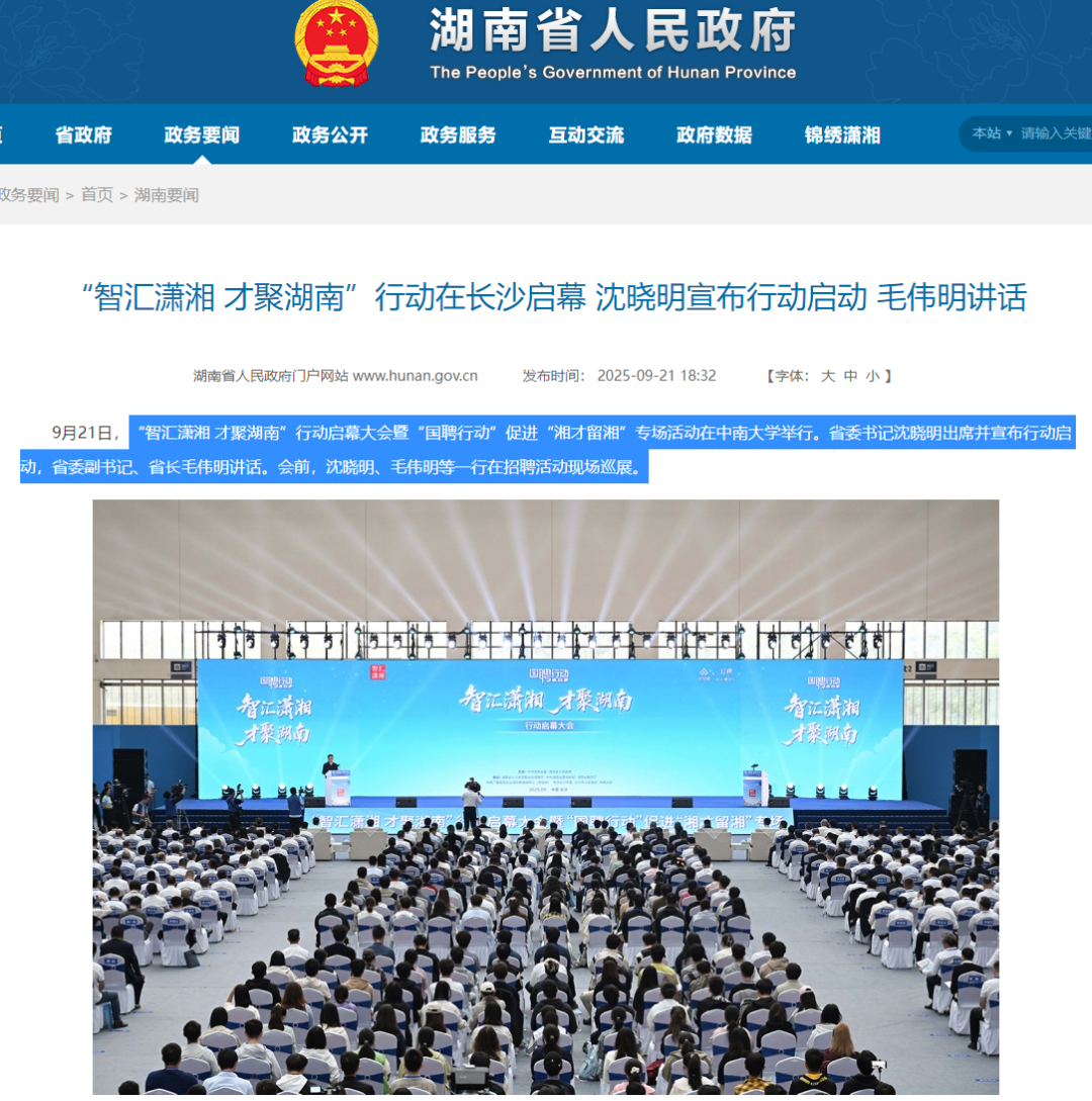 9月21日,“智汇潇湘 才聚湖南”行动启幕大会暨“国聘行动”促进“湘才留湘”专场活动在中南大学举行。