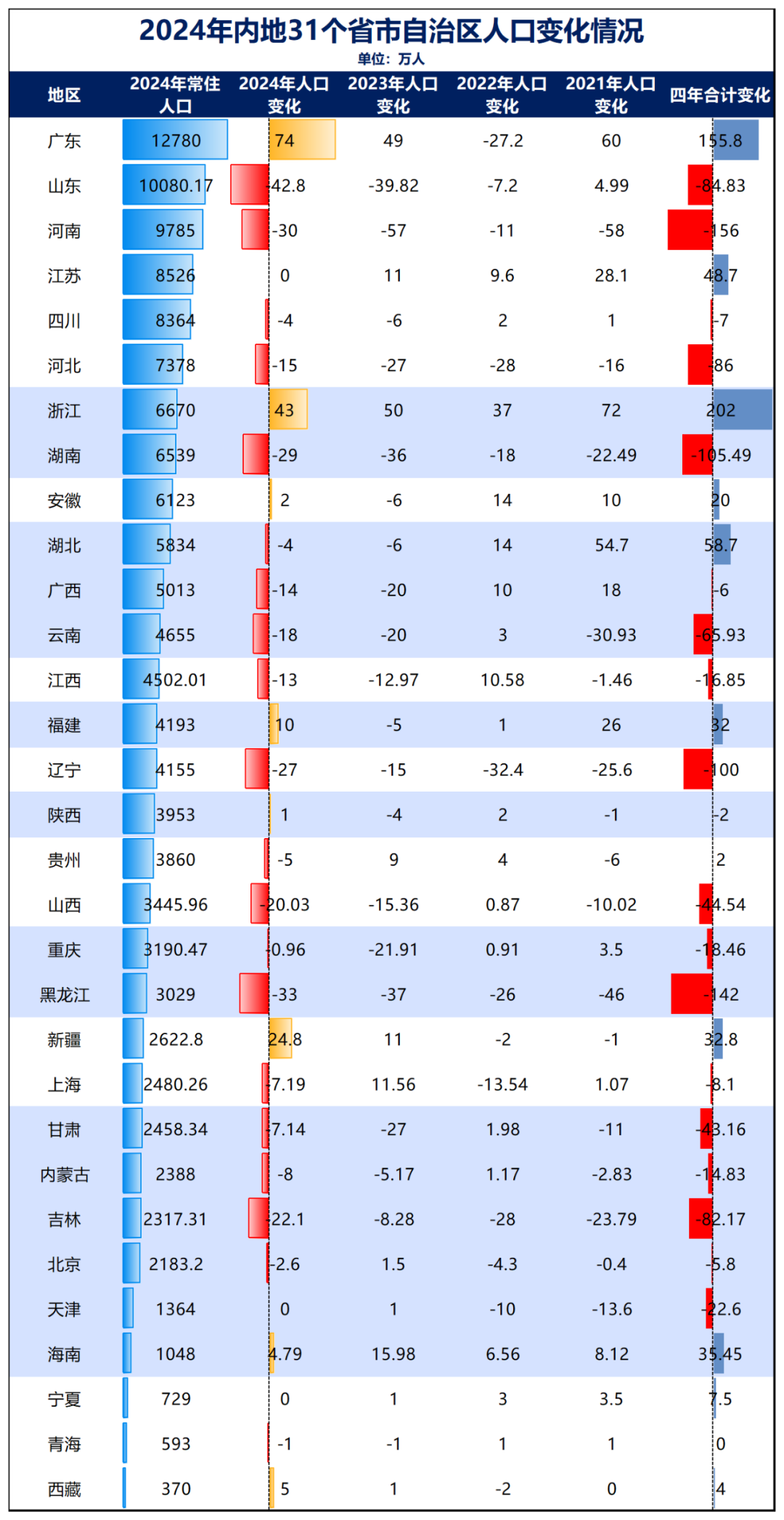 第二,四年常住人口合计减少超100万,减少量位居南方第一,全国第三。