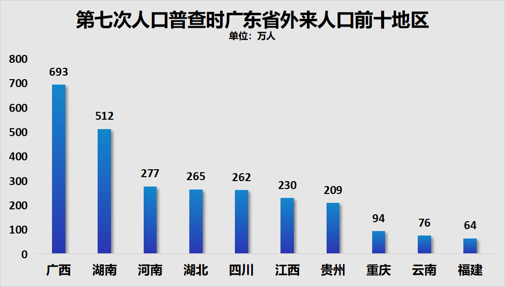这2962万外地人中,广西人最多,有693万人。其次是湖南512万人。河南、湖北、四川、江西、贵州、重庆、云南、福建位居前十。