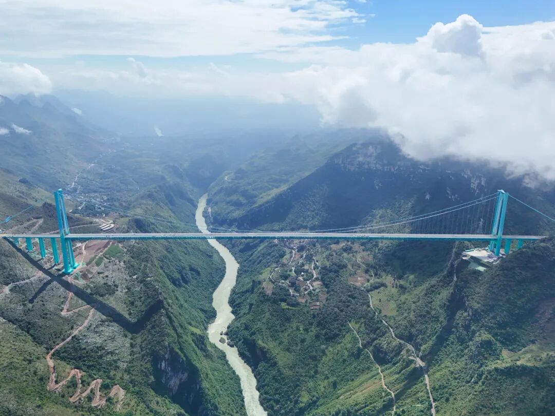 花江峡谷大桥,是世界山区峡谷第一大跨度钢桁梁悬索桥,大桥全长2890米,主跨径达1420米,其桥面距水面垂直高度625米,为世界第一高桥。