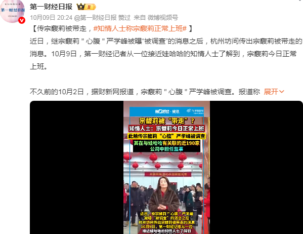 真相尚不明晰,又传出了宗馥莉被带走的消息,但有媒体昨日求证娃哈哈,宗馥莉仍正常上班。