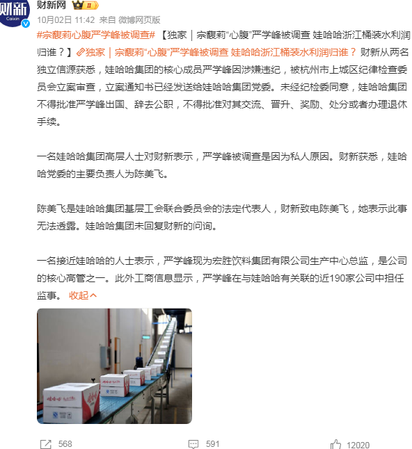 不久前的10月2日,宗馥莉“心腹”严学峰被调查。报道称,娃哈哈集团的核心成员严学峰因涉嫌违纪,被杭州市上城区纪律检查委员会立案审查,立案通知书已经发送给娃哈哈集团党委。