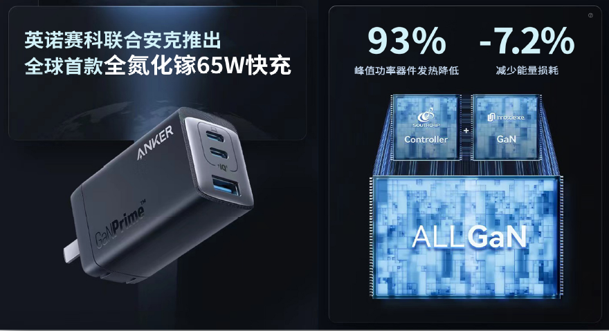 随后,智能充电品牌安克也采用了英诺赛科的氮化镓芯片,两家共同发布了全球首款65W全氮化镓快充,携手把手机快充设备推进到“氮化镓时代”。
