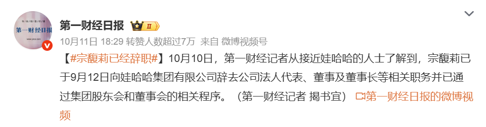 宗馥莉辞去娃哈哈董事长一职了。这意味着,宗馥莉失去对娃哈哈的控制权了,只剩下29.4%的股权。这个股权看起来不少,但实际上,挺虚的。为什么呢?因为在宗庆后时代,杭州上城文商旅集团作为娃哈哈第一大股东,持股46%,却没有拿过一分钱的分红。
