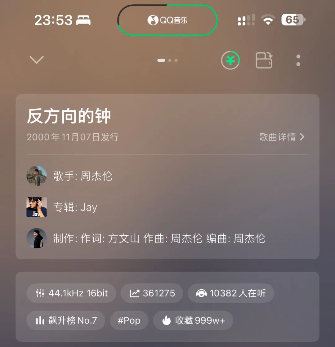 2025年10月8日23:53分,10382人同时在听周杰伦的《反方向的钟》,让这首20年前的老歌冲上平台飙升榜第七。