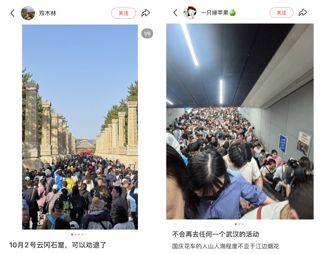如果为躺在家里过了8天长假而感到遗憾,不妨打开社交平台搜索“你想去的目的地+国庆”,几乎每个帖子的内容都差不多:别来;能劝一个是一个;劝退;避雷;翻车。