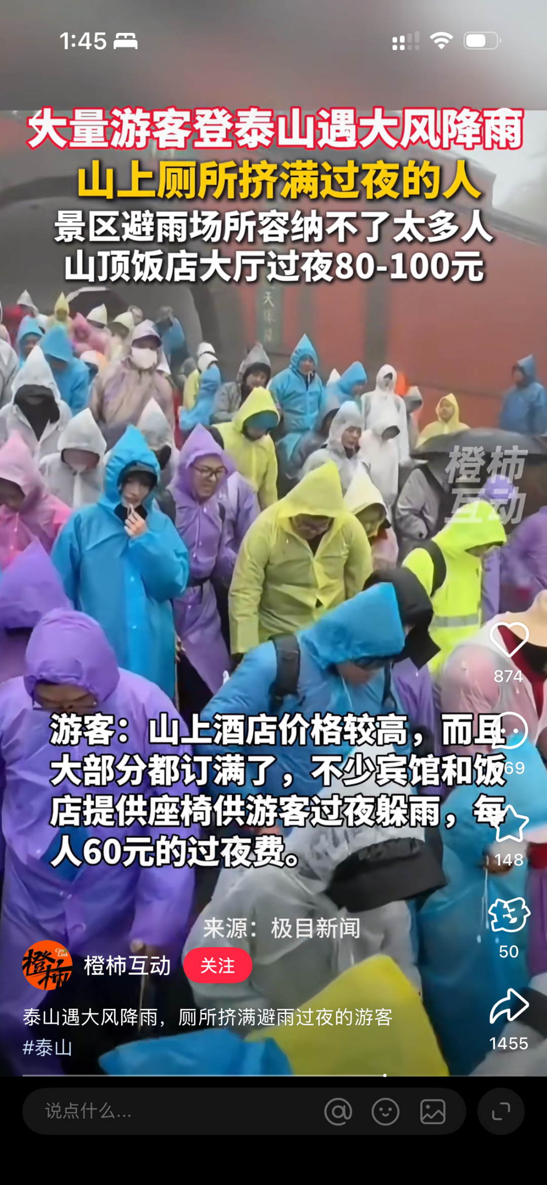 10月1号晚上还下起了小雨,气温骤降,没酒店住的游客要么花80-100元在山顶的饭店大厅过夜,要么在山上的厕所躲雨。雨一直下到第二天,当然也没有日出,好惨。