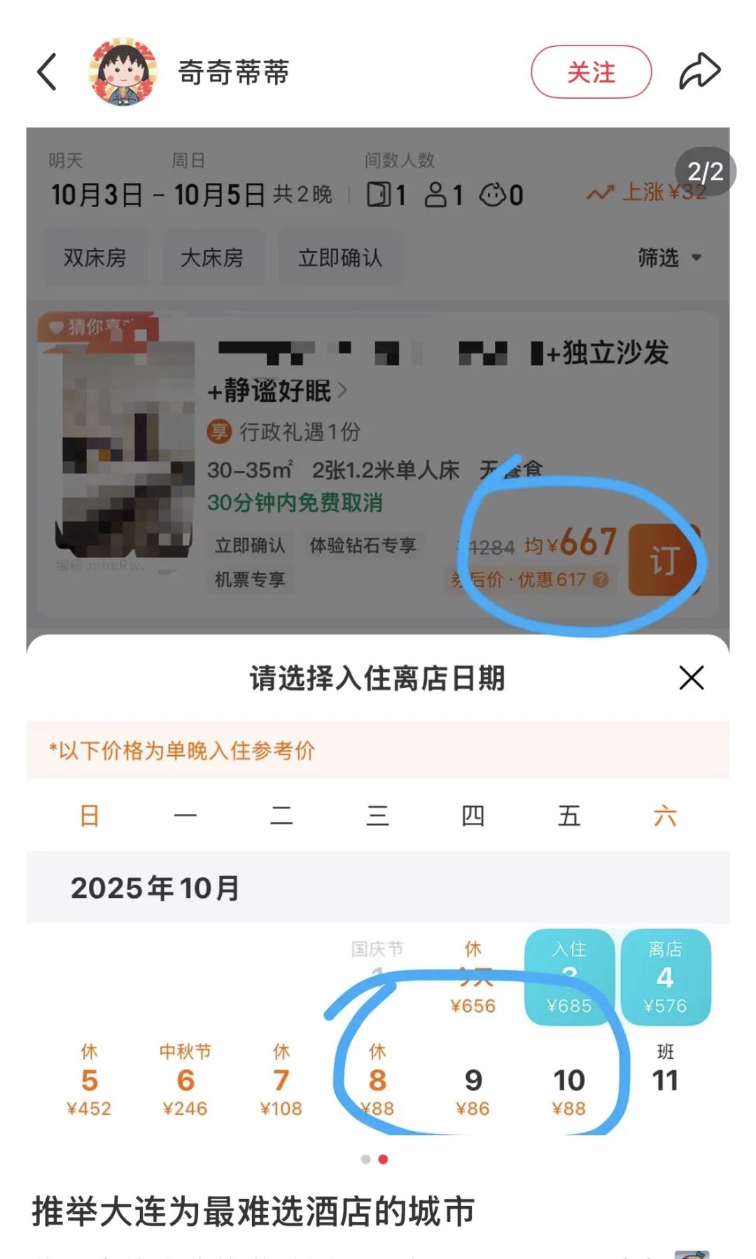 大连这家普普通通的酒店平日价格是88元,国庆期间最高涨到了685元;亚朵和桔子都从平日的300多涨到了1000+。