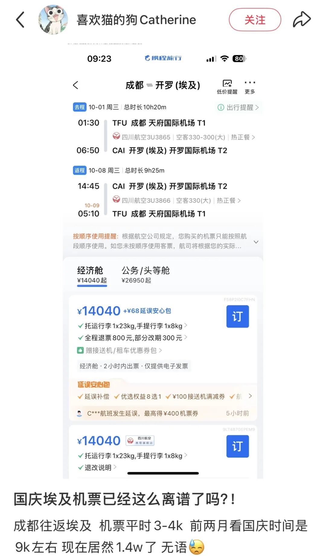 如果想去更远一些的地方,比如欧洲、非洲,国庆机票动辄一万往返起步,还没迈出国门,普通白领一个月的工资就搭进去了。