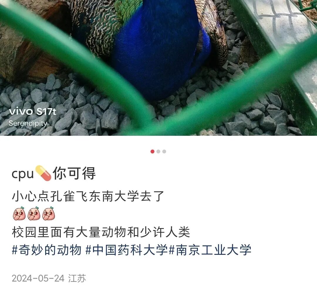 除了猫猫狗狗,还有漫步在马路上,还会时不时秀恩爱的黑天鹅、隐藏在教学楼附近,同学们生怕被隔壁东南大学“拐走”的孔雀……