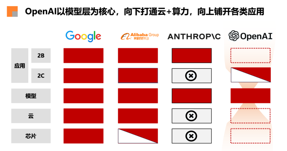 在全球范围,有2家公司已经具备领先的全栈能力,分别是美国的谷歌和中国的阿里。这两家科技大厂均通过全栈能力,在今年实现了对OpenAI模型能力的并跑,进入全球模型能力第一梯队,并在云服务、算力基建和上层应用端都有深厚积累和先发优势,对OpenAI的生态位构成了强而有力的直接竞争和潜在威胁。