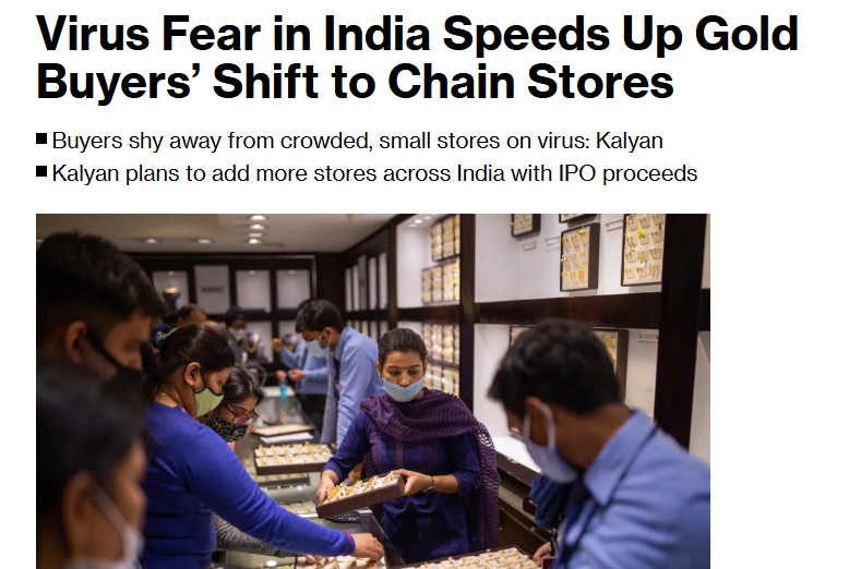 当然,你也不能说印度人一点安全意识都没有,根据彭博社报道,为了减少感染风险,部分印度民众选择避开拥挤的小金店,跑去价格更贵、人更少的大型连锁店。