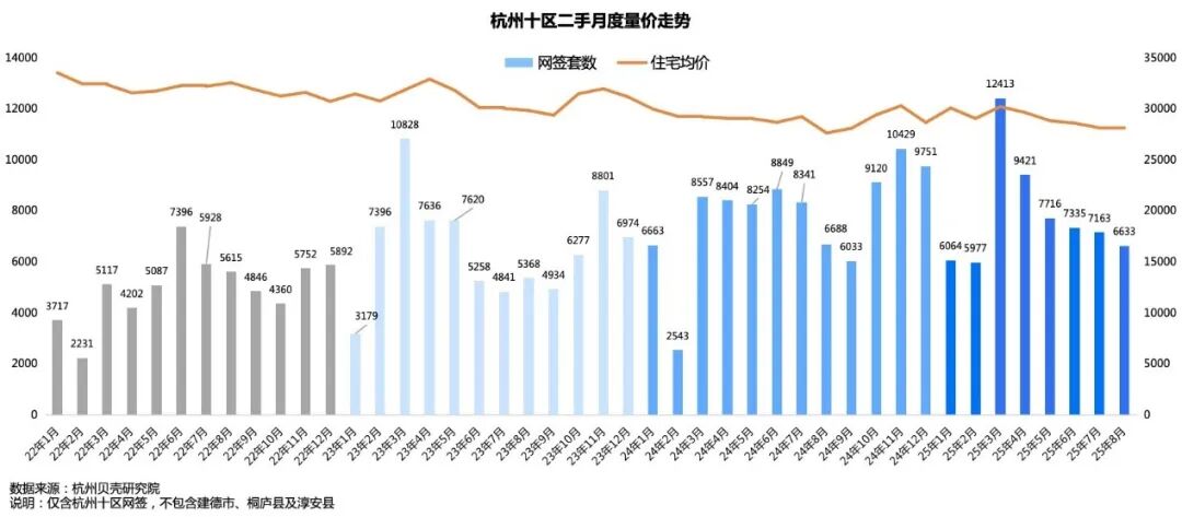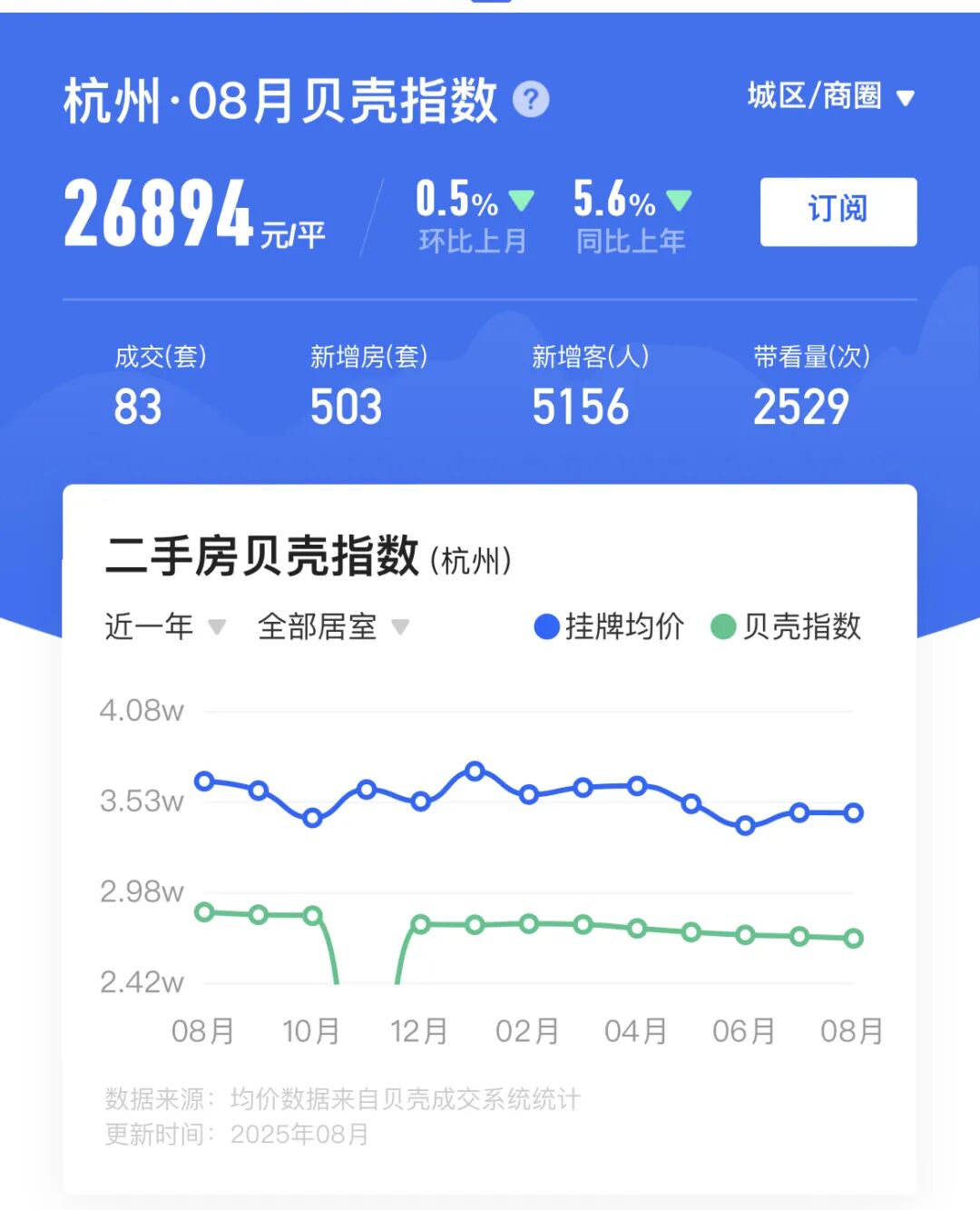 杭州本地媒体钱江晚报旗下的“钱报杭州房产”最新发布的一篇文章《杭州卖得最快的二手房,降价10%到30%成功出售!》,透露了当下杭州房价的很多关键信息:贝壳平台今年6-8月的成交房源中,有近七成房源在180天内降价10%~30%后成功出售,而降价5%以内的房源成交占比不足5%。第二,当下杭州挂牌二手房中的调价房源,94%在降价。作为今年城市话题C位的杭州尚且如此,其他城市何尝不是如此。最关键的是,即便这样的降价力度,也没能换来好的成交。8月份,杭州市区(含富阳、临安)共成交二手房6633套,环比7月下滑7.4%;同比去年8月基本一致,微降0.88%。今年开年,在宇树科技人工智能和DS概念加持下,杭州楼市开局便拉满。3月份杭州二手房市场火力全开,“小阳春”变“大阳春”,十区共成交二手房12413套,仅次于2017年4月的12666套,创下近8年来新高。3月二手房还实现量价齐升。杭州贝壳研究院数据显示,3月杭州十区住宅成交均价为30210元/㎡,环比2月提升4.0%,同比去年3月提升3.4%。而3月末,杭州的土地市场更是热火朝天,一周内诞生了两个地王,楼面价不断创新高,先后超越广州、深圳。按照当时的行情和热度预演,4月份的杭州市场,本该热火朝天才是。但势头戛然而止。4月份二手房网签量9421套,5月份7716套,6月份7335套,7月份7163套,8月份快速降至6633套。02