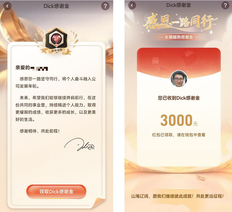 最近,不少顺丰小哥在社交平台分享自己的喜悦,晒出了自己收到的红包,少则1000块,多则2000、3000块。这些红包全是顺丰总裁王卫以个人名义,向小哥们发放的“感谢金”。红包的金额与工作年限挂钩:10年以上的1000,15年以上的2000,20年以上的3000。所有红包加起来,总金额高达1.2亿元,共约10万名小哥拿到了红包。早在2017年顺丰上市时,王卫便曾给全体约40万名员工发放数额不等的红包,有员工收到的金额高达数千元;