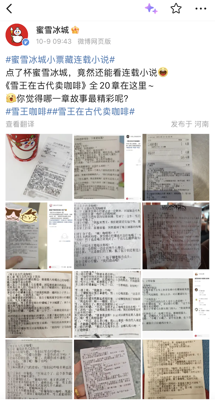 九月底十月初,有网友发现,蜜雪冰城的奶茶小票竟“暗藏玄机”,印着题为《雪王在古代卖咖啡》的连载小说,不过仅有短短一章,吊足了胃口,于是纷纷发帖众筹前后文。
