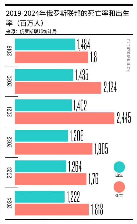 俄联邦统计局数据显示,2024年俄罗斯人口自然下降近60万人,降幅增长了20.4%。也就是说照这个速度下去,300年后俄罗斯这个国家就“消失了”。