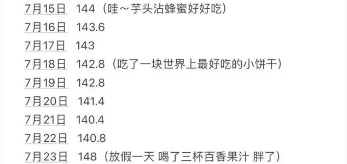 单从这份减肥日志,不难看出她并非完全靠意志力坚持,有时她也会“破戒”吃高热量的食物:“吃甜食、喝奶茶……”。