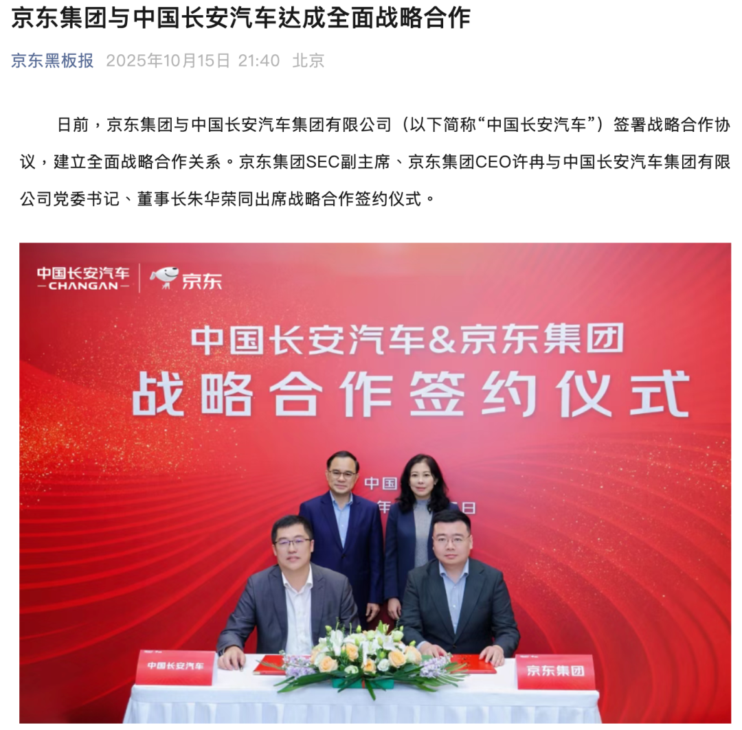 次日,京东汽车又与央企长安汽车签署战略合作。