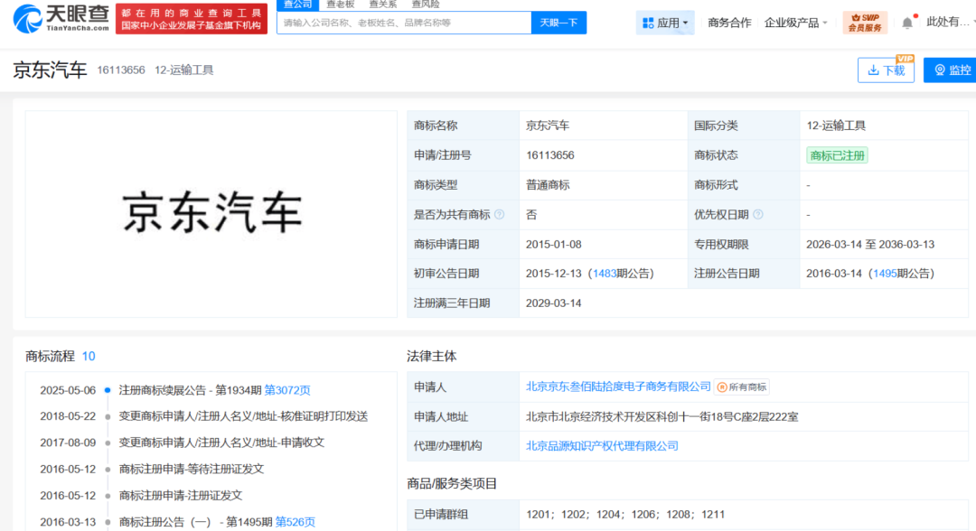 天眼查信息显示,北京京东叁佰陆拾度电子商务有限公司已注册“京东汽车”“京东汽车 JD AUTO”“CAR.JD.COM”等商标,覆盖运输工具、广告销售、科学仪器等多个领域。