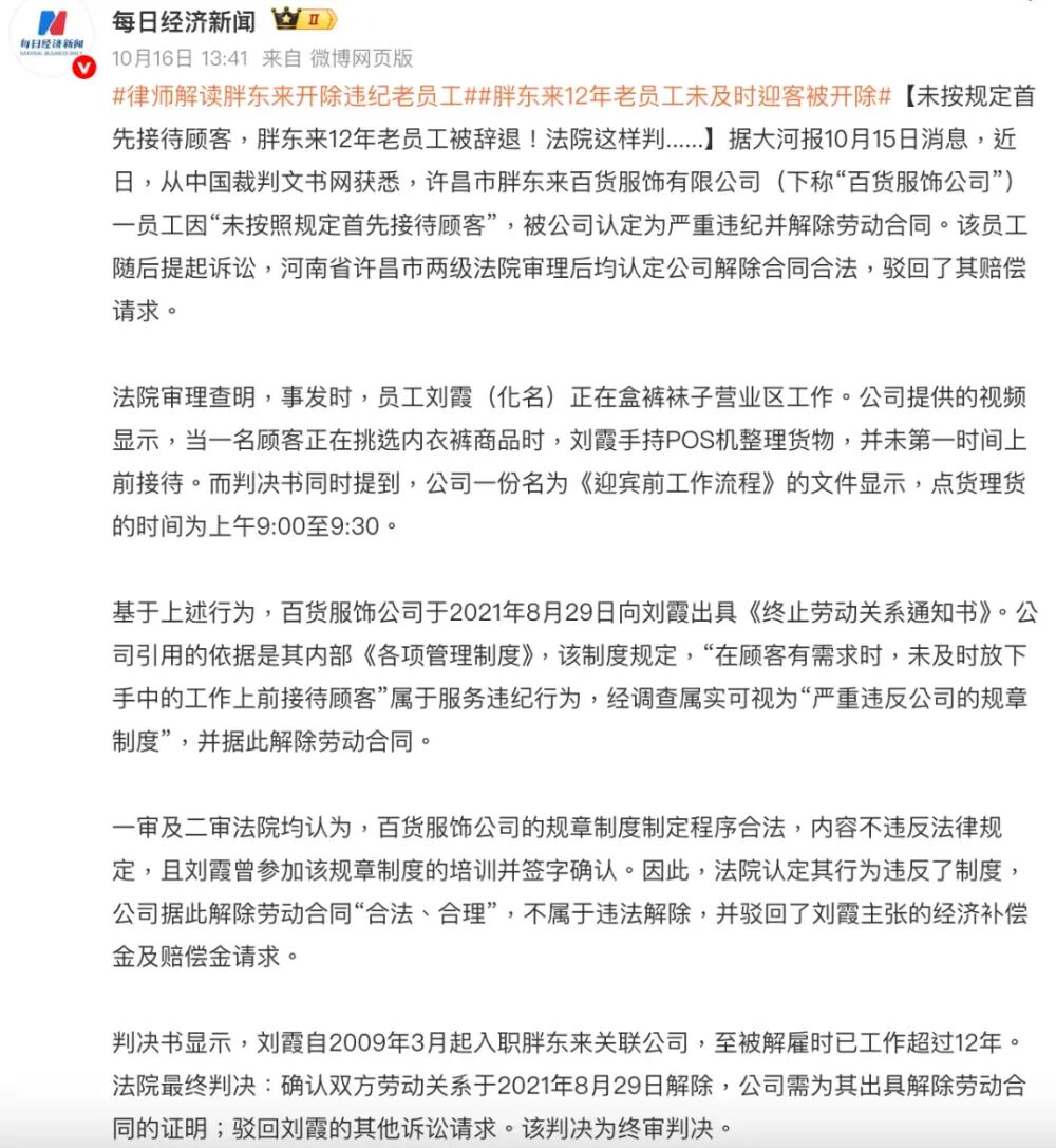 不同于以往因为“假期多”“工资高”“待遇好”而收获的掌声,这次,它的名字被卷入了一场关于开除的争论。一名在胖东来工作了12年的老员工,因为“未能及时接待顾客”被解雇。故事的开始,是2021年8月的一个早晨,刘霞(化名)像往常一样在胖东来门店整理货架。那时她已经在这家公司干了整整12年,是熟悉超市每个角落的老员工。她手里拿着POS机,正忙着盘点袜子区域的货品。几米之外,一位顾客正驻足挑选内衣裤。根据公司内部规定,员工应当“在顾客有需求时立即上前接待”。公司依据《各项管理制度》做出处罚,理由是“在顾客有需求时,未及时放下手中的工作上前接待顾客”属于服务违纪行为。如果换作其他行业,也许这只是一次口头警告。但胖东来的制度是“白纸黑字”的。有意思的是,另一份内部文件《迎宾前工作流程》中明确写着:员工理货时间为上午9:00到9:30。而刘霞被拍到未接待顾客的时刻,正好在这个时间段。她因此提起劳动仲裁,但败诉。法院认为,她曾在培训中签字确认过相关制度,公司依据规定行事,并无不当。从法律层面看,这是无可挑剔的,但从情感层面看,却让人感受到一种冰冷。尤其是在如今打工人各种被“优化”的就业环境下,刘霞的经历得到了很多网友的共情。网友的共情并非简单的同情,而是由此触发的疑问:当制度被执行得滴水不漏,它还会容纳人的不完美吗?一纸判决,结束了刘霞十二年的职业生涯,这不得不让人重新思考,当制度完美无缺时,是否意味着它真的合理?它是许昌的城市名片,是抖音的“流量景区”,更是被雷军、马云点赞的“零售传奇”。从服务到环境,从价格到管理,每一个细节都被网友当作范本学习。这种光环的形成,不仅靠货架上的商品,更靠它一贯的理念:尊重人、理解人、善待人。