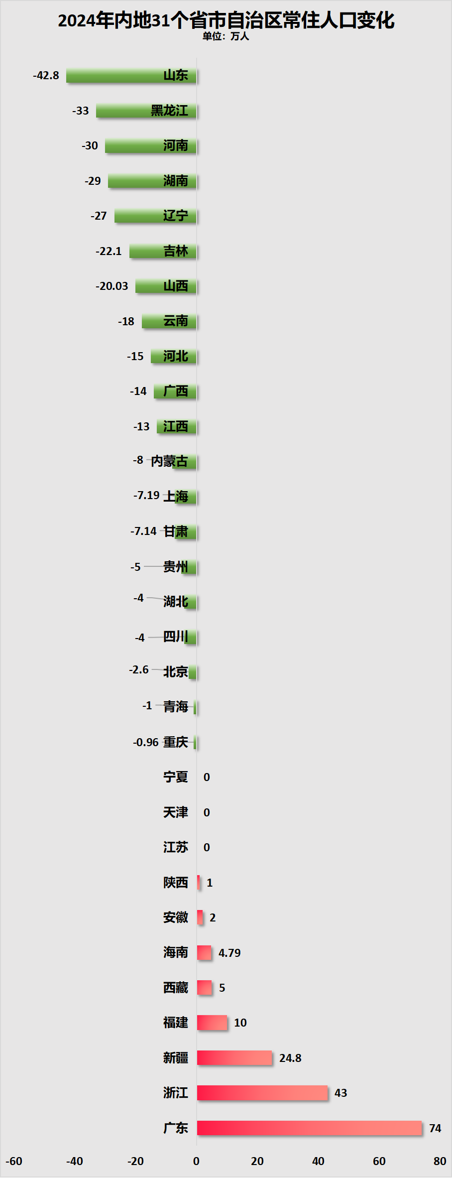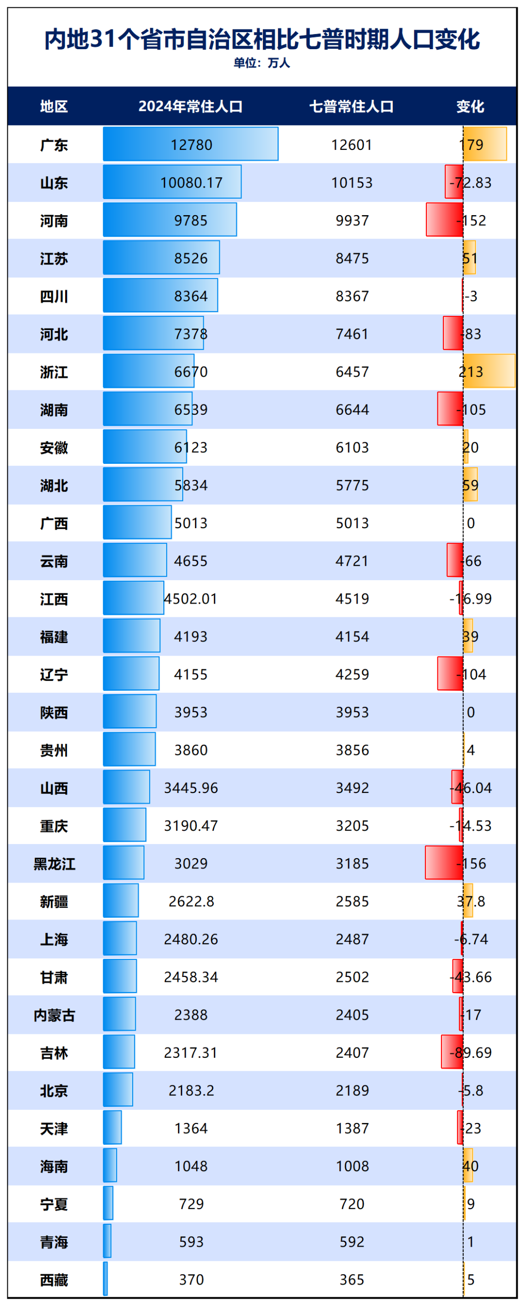 以上是第七次人口普查公布的各省市自治区数据,可以看到:尤其是广东,堪称人口吸泵,十年增加了2169万。当然,这些增量大部分集中在深圳、广州。深圳七普时期人口增加了713.6万,广州增加了597.7万,仅这两座城市就增加了1311.3万人。第二,31个省市自治区,七普时期有25个地区人口增加,仅6个地区人口下降。东北三省2010年至2020年十年间,合计减少了1099万人。其中黑龙江减少最多,减少646万人,其次是吉林减少338万人,辽宁减少115万人。第一,人口增量第一省从之前的广东变成了浙江,广东人口增量位居第二。浙江与广东,也是仅有的两个过去四年人口增量超百万的省。第二,内地31个省市自治区,有17个人口下降,2个持平,12个增长。过去四年,东北地区人口依旧在减少,其中黑龙江人口减少规模依旧全国第一,减少了156万人,辽宁减少104万人,吉林减少86.69万人,东北三省合计减少349.69万人。过去四年,山河四省集体陷入负增长,河南人口减少152万,山东减少72.83万,河北减少83万人,山西减少46.04万人,山河四省合计减少343.87万人。第四,四大直辖市人口集体减少。相比于七普数据,北京减少5.8万人,上海减少6.74万人,重庆减少14.53万人,天津减少23万人。第五,在过去四年人口变化过程中,浙江常住人口规模超越湖南,位居全国第7,湖南降至第8。福建超辽宁,位居第14,辽宁降至第15。新疆超越上海,内蒙古超越吉林。以上是2024年相比于七普时期的变化,也即过去四年的变化。过去四年中,第一年人口红利仍在,但从第二年开始人口见顶向下。自2022年全国人口见顶之后,人口变化局面非常快。2020年七普时期人口减少的地区仅6个,而到2024年时,相较于2023年,人口减少的地区增至20个。制图:城市财经;数据:各省市自治区统计局