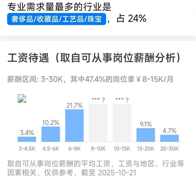 在薪资待遇方面,珠宝专业虽然不像小说里写的那样,毕业就年薪百万,但确实也不算低。