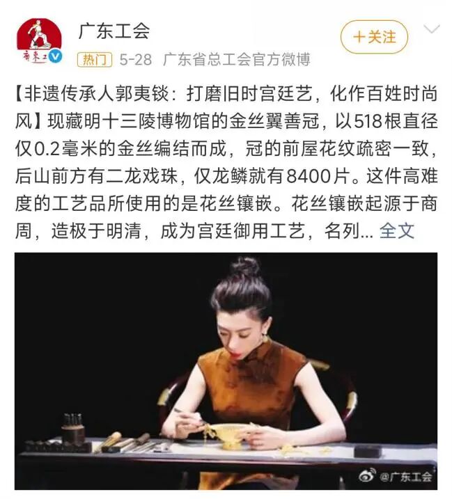 2006 年她加入百年品牌萃华珠宝后,打破传统黄金珠宝的刻板印象,将动漫元素与非遗技艺结合,采用花丝镶嵌与錾刻技艺打造了一件,仅重 950 克的作品,在 2007 年深圳国际珠宝展上一举 “出圈”。