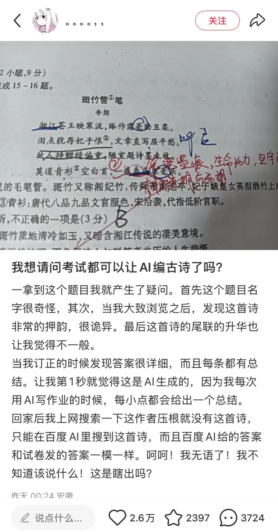 前几天刷到有人说,最近考试时做古诗赏析题,结果赏析的是AI编的“古诗”。