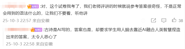 不光是诗歌本身,试卷给出的答案也充斥着AI生成的痕迹,“不是正常会用的语法”。