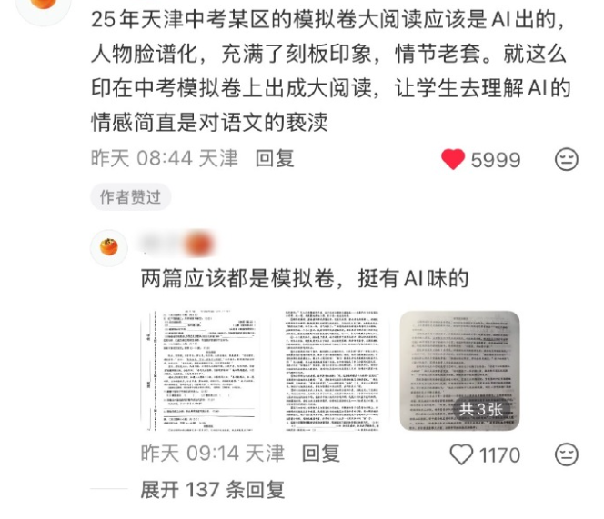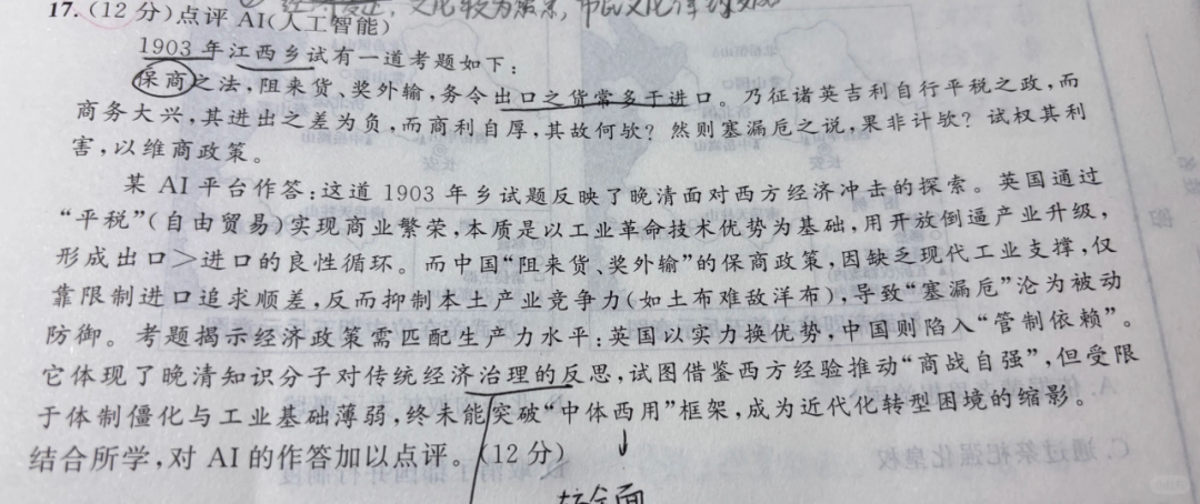 同样是用AI出题,有的试卷换了一种方式,把AI给的答案放进题目,让学生进行点评。