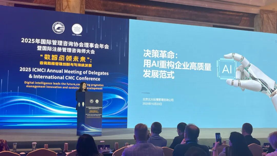 10月23日,全球管理咨询界迎来年度盛会——2025年国际管理咨询协会理事会(ICMCI)年会于上海隆重举行。本届峰会以 “数智引领未来:咨询助推管理创新与可持续发展” 为主题,汇聚了来自世界各地的顶尖咨询机构领袖与专家学者。北大纵横集团总裁谢凡女士作为中国管理咨询行业的杰出代表,受邀出席并担任演讲嘉宾。