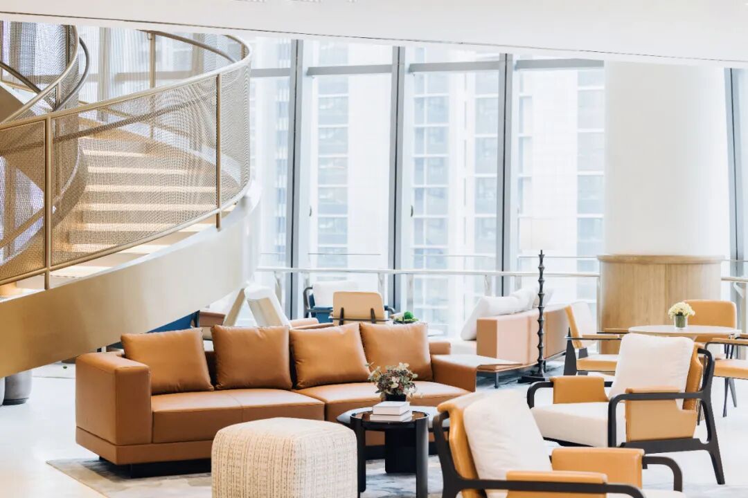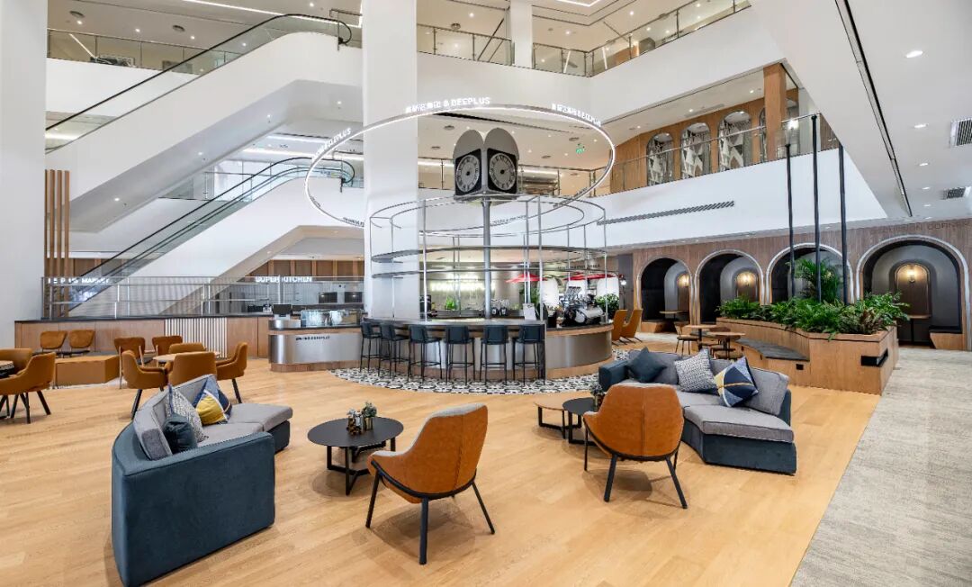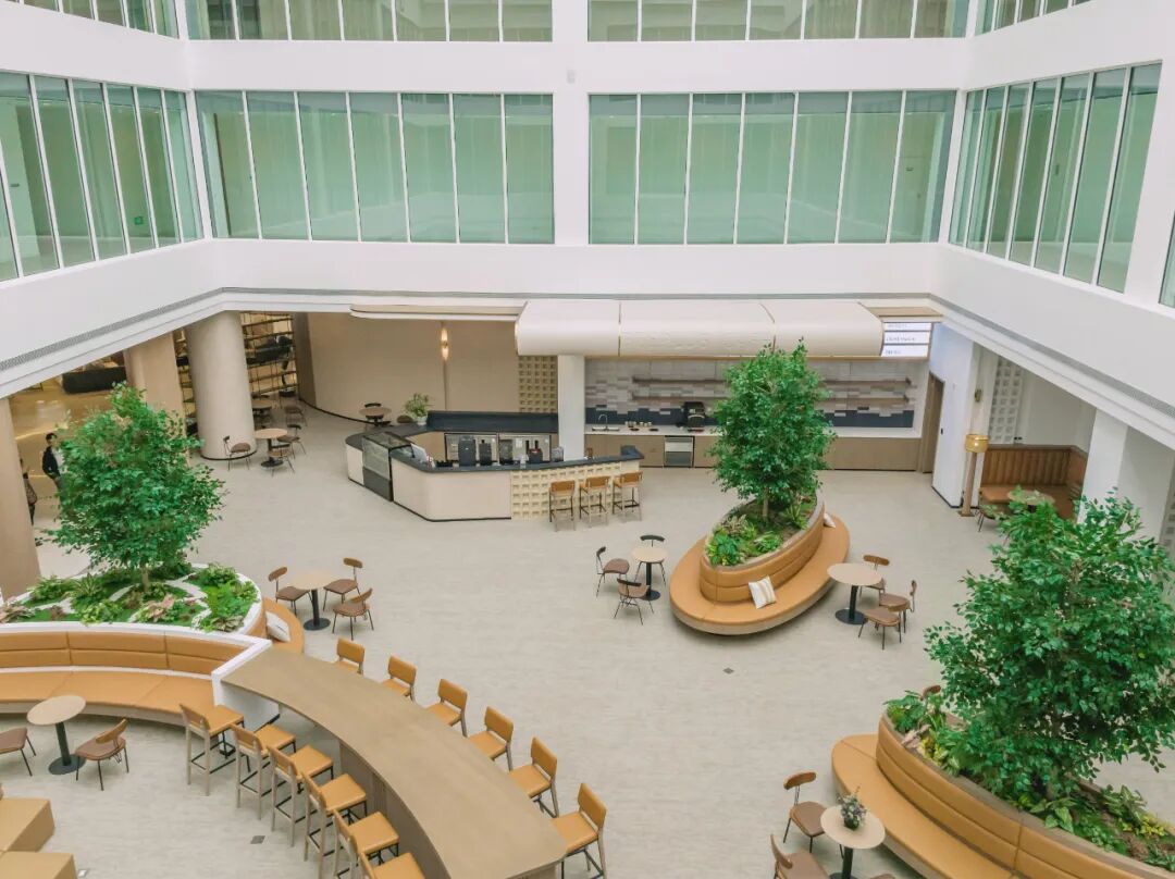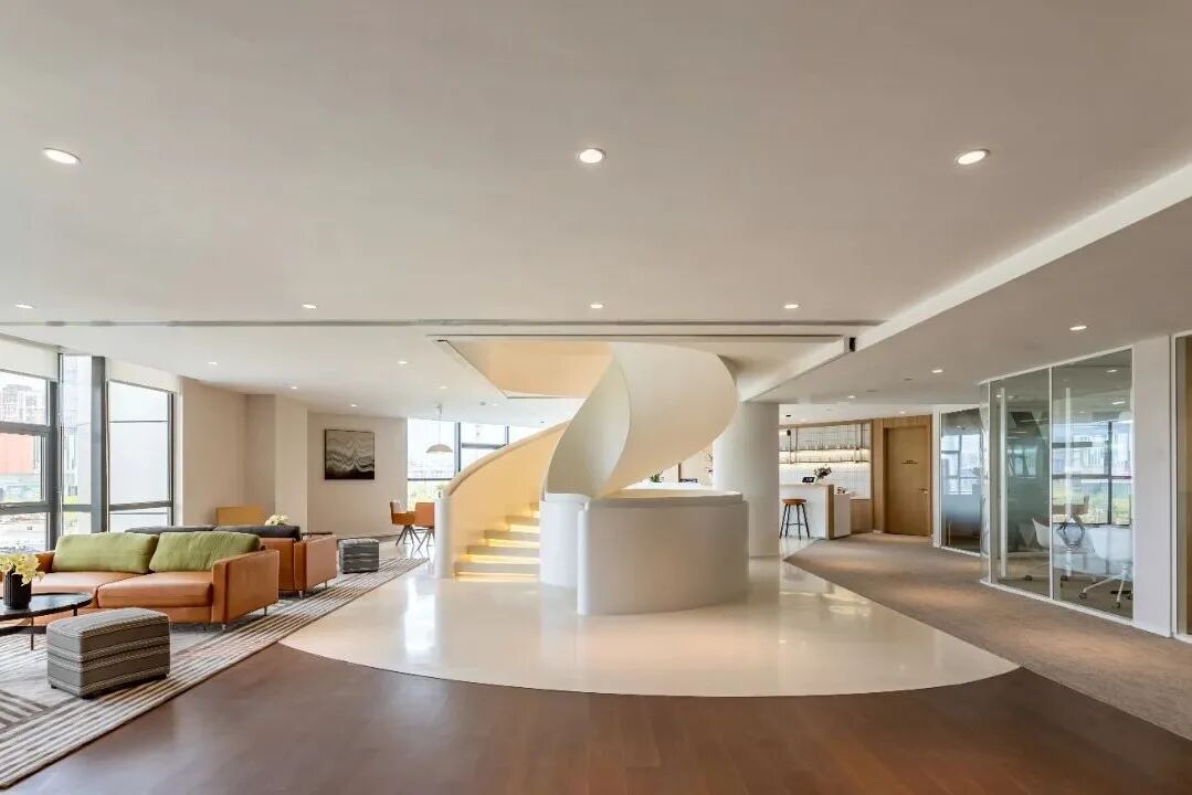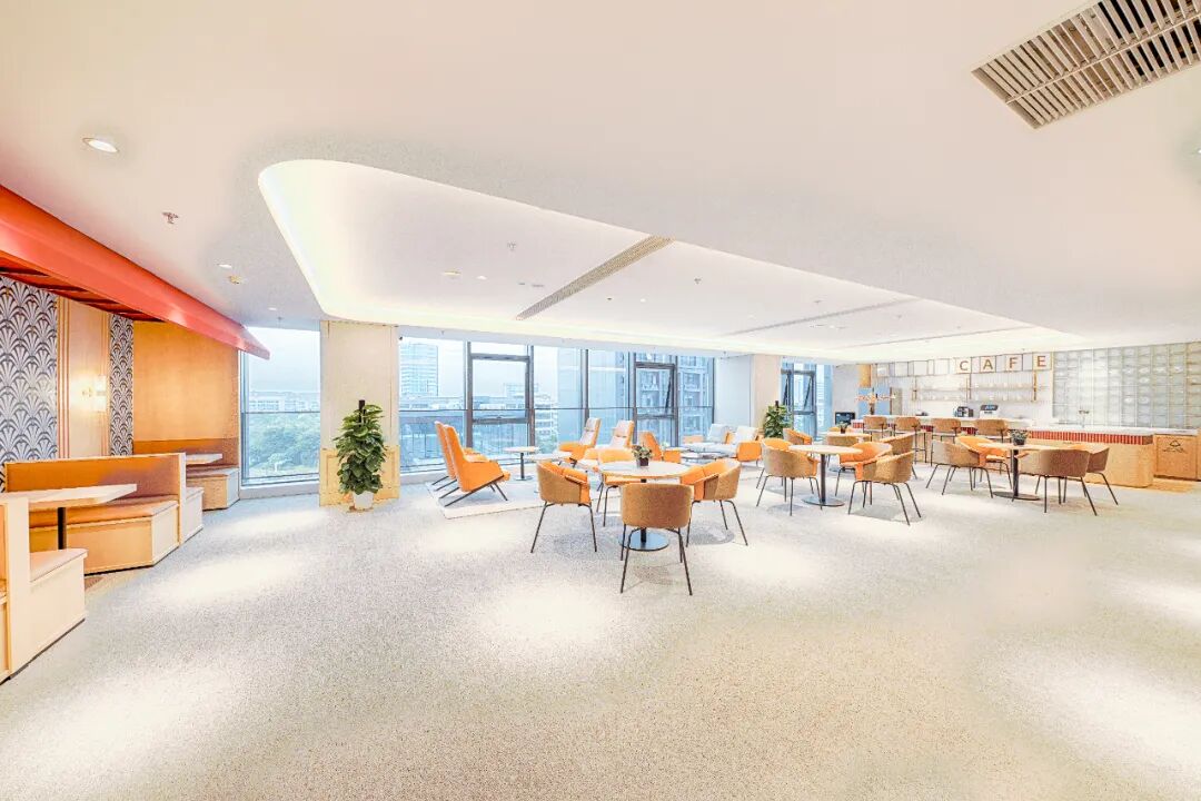 项目位于广州知识城广场,聚合高级人才公寓、五星级酒店、会展中心、知识产权法院、知识产权博物馆等资源。设计上为到访者构建信息互换与休憩松弛的舒适空间,中庭园林氧吧里挺立着数棵高耸乔木,整栋大楼借助玻璃落地窗将光线运用得恰到好处,四处分布的居家风元素与绿色植物相衬,为商务氛围增添了一份别样的鲜活气息。公司注册、搬家等服务一键即达,让企业安心启新。